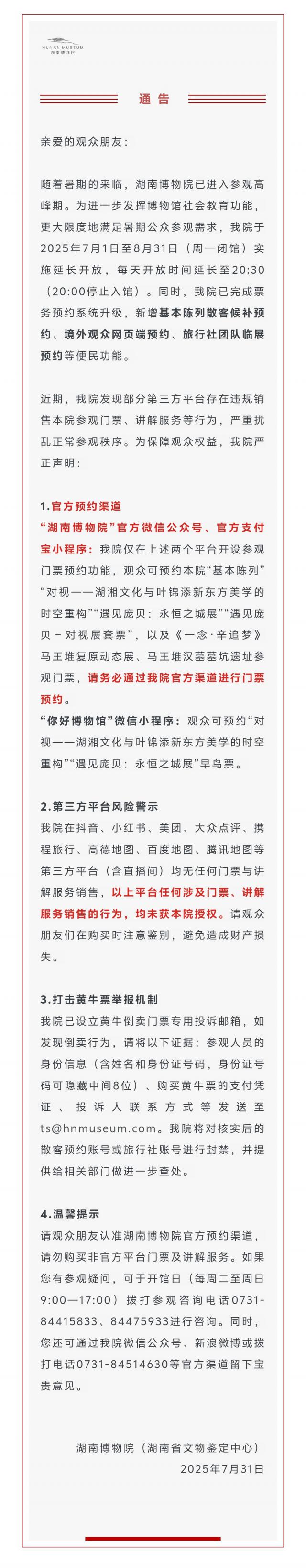 7 月 31 日炒股配资股票开户,湖南博物院发布"关于规范票务预约"的严正声明,全文如下: